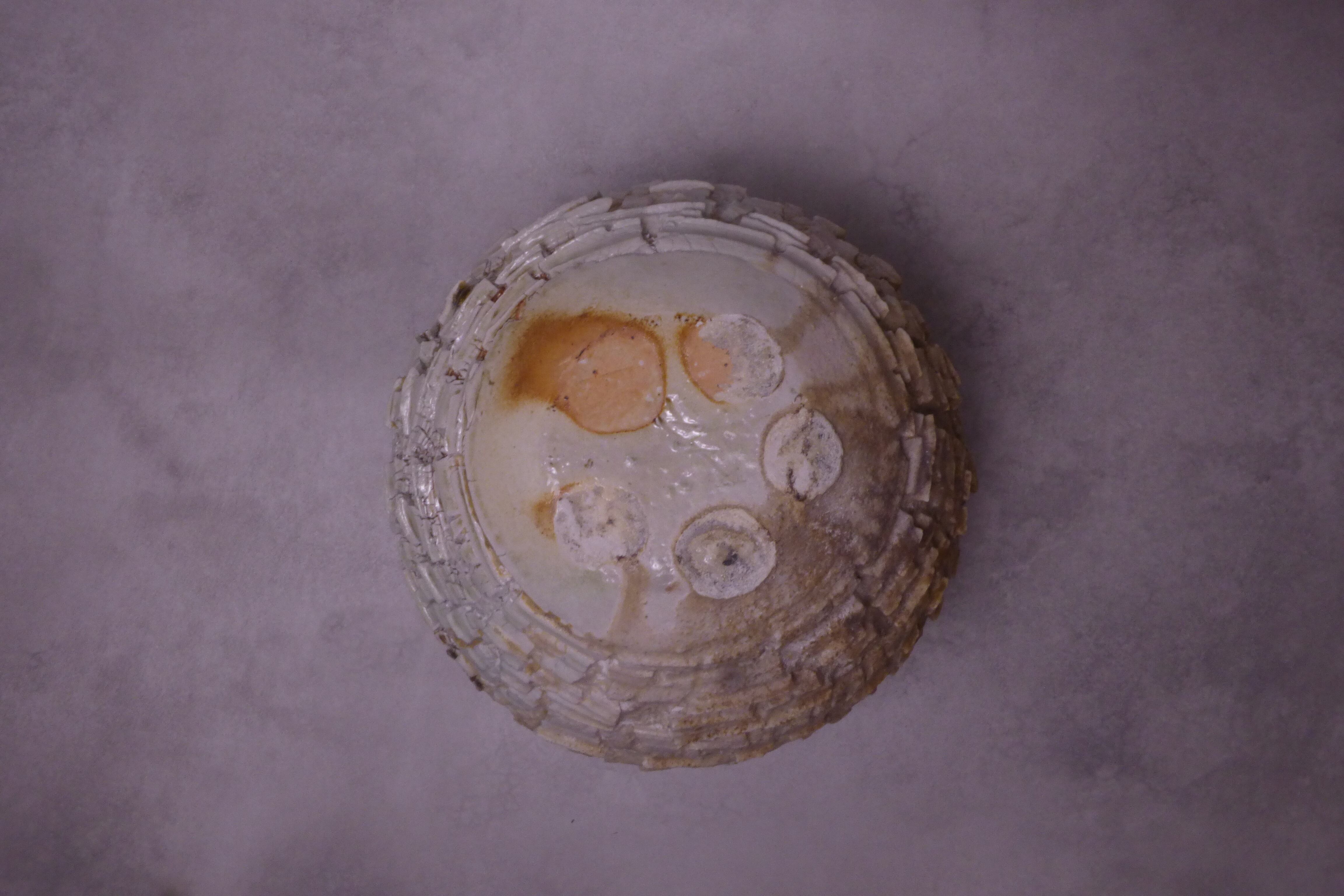 這個盆器是在傳統的柴窯——也就是古老的「穴窯」中,經過三天三夜薪火淬煉而成。