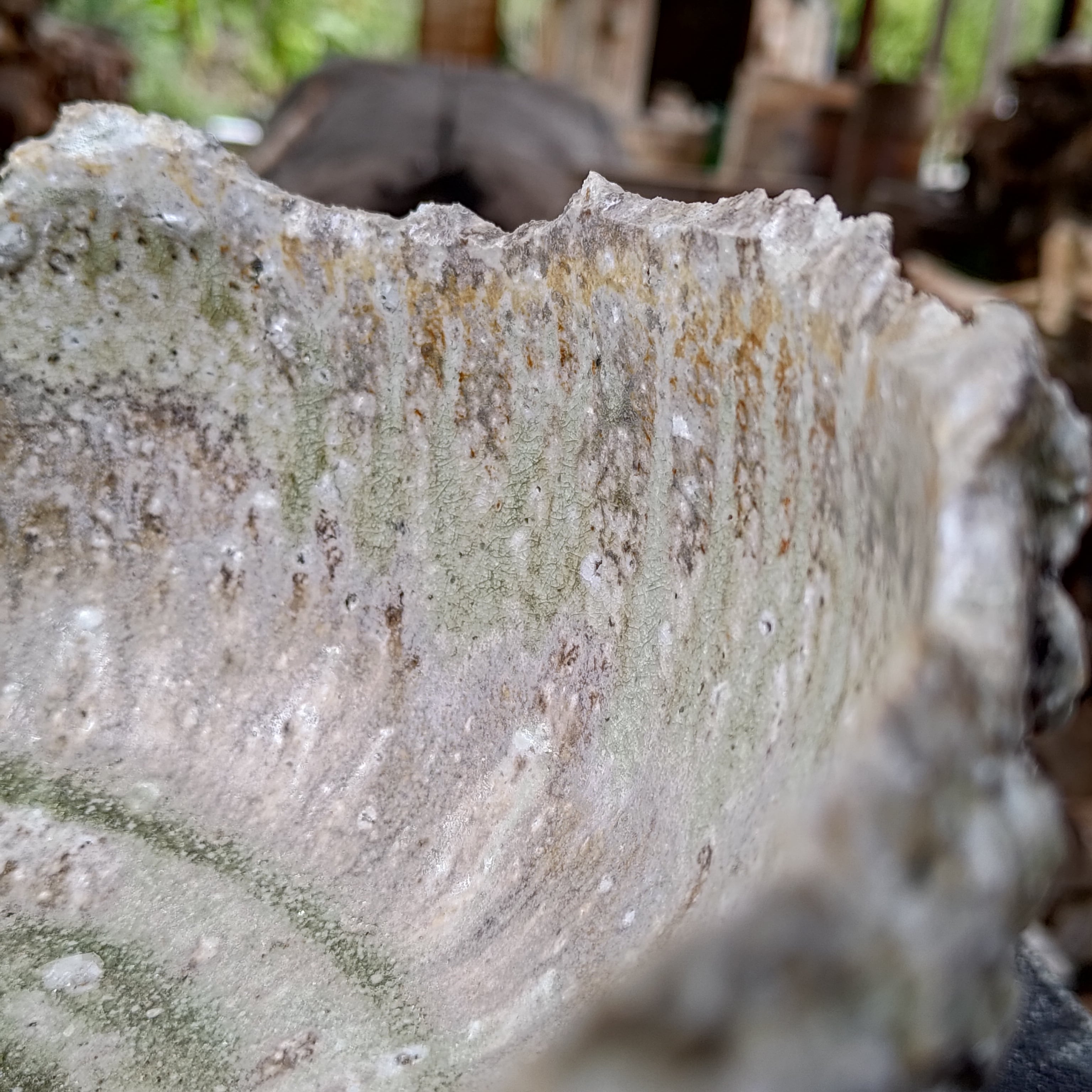 這個盆器是在傳統的柴窯——也就是古老的「穴窯」中,經過三天三夜薪火淬煉而成。