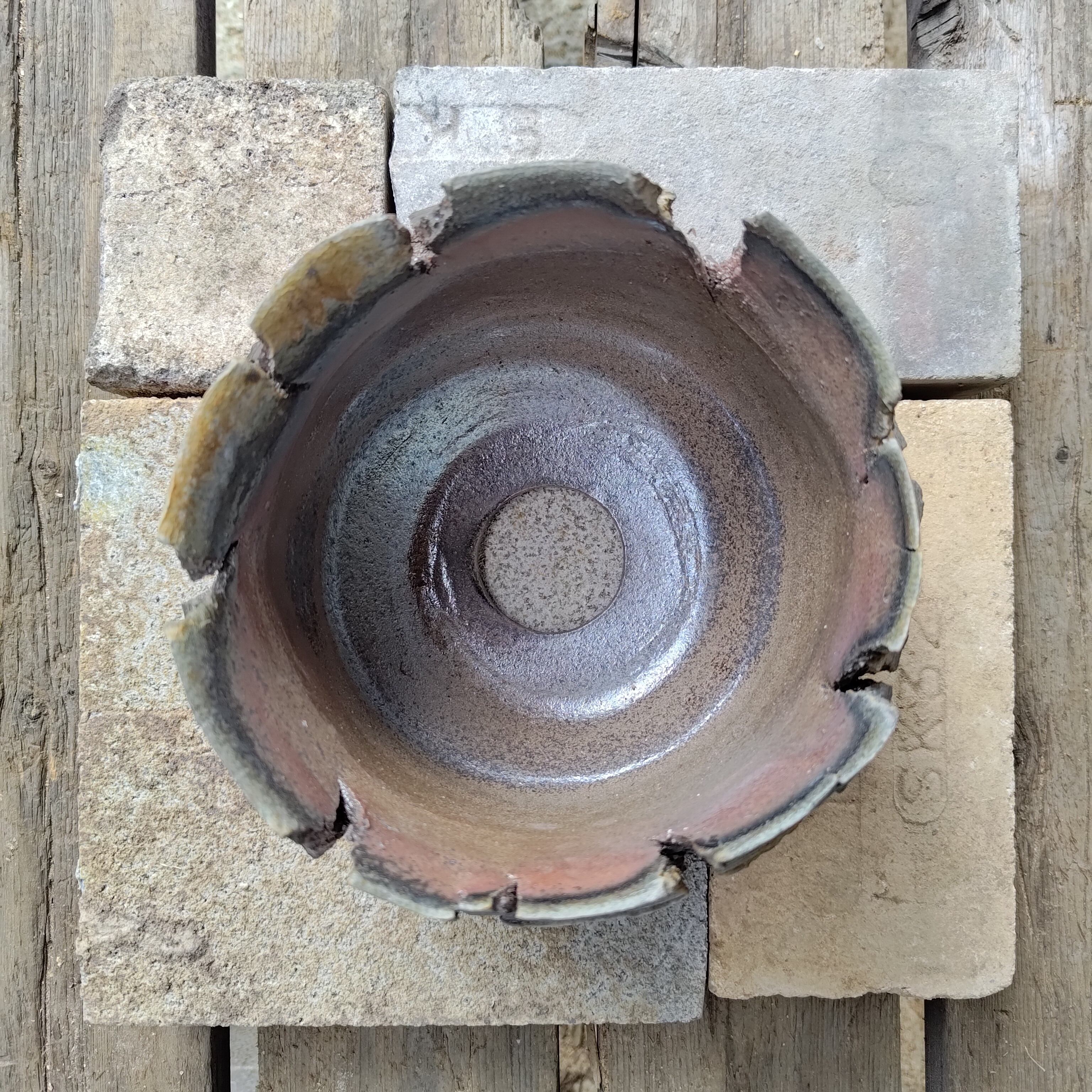 這個盆器是在傳統的柴窯——也就是古老的「穴窯」中,經過三天三夜薪火淬煉而成。