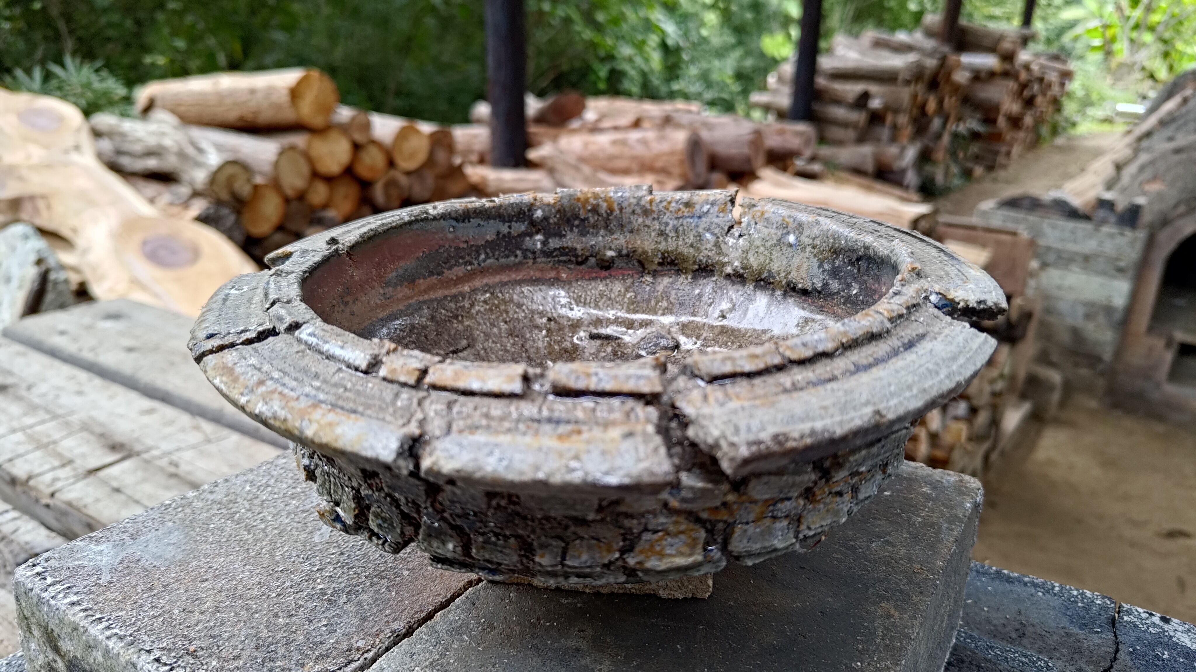 這個盆器是在傳統的柴窯——也就是古老的「穴窯」中,經過三天三夜薪火淬煉而成。