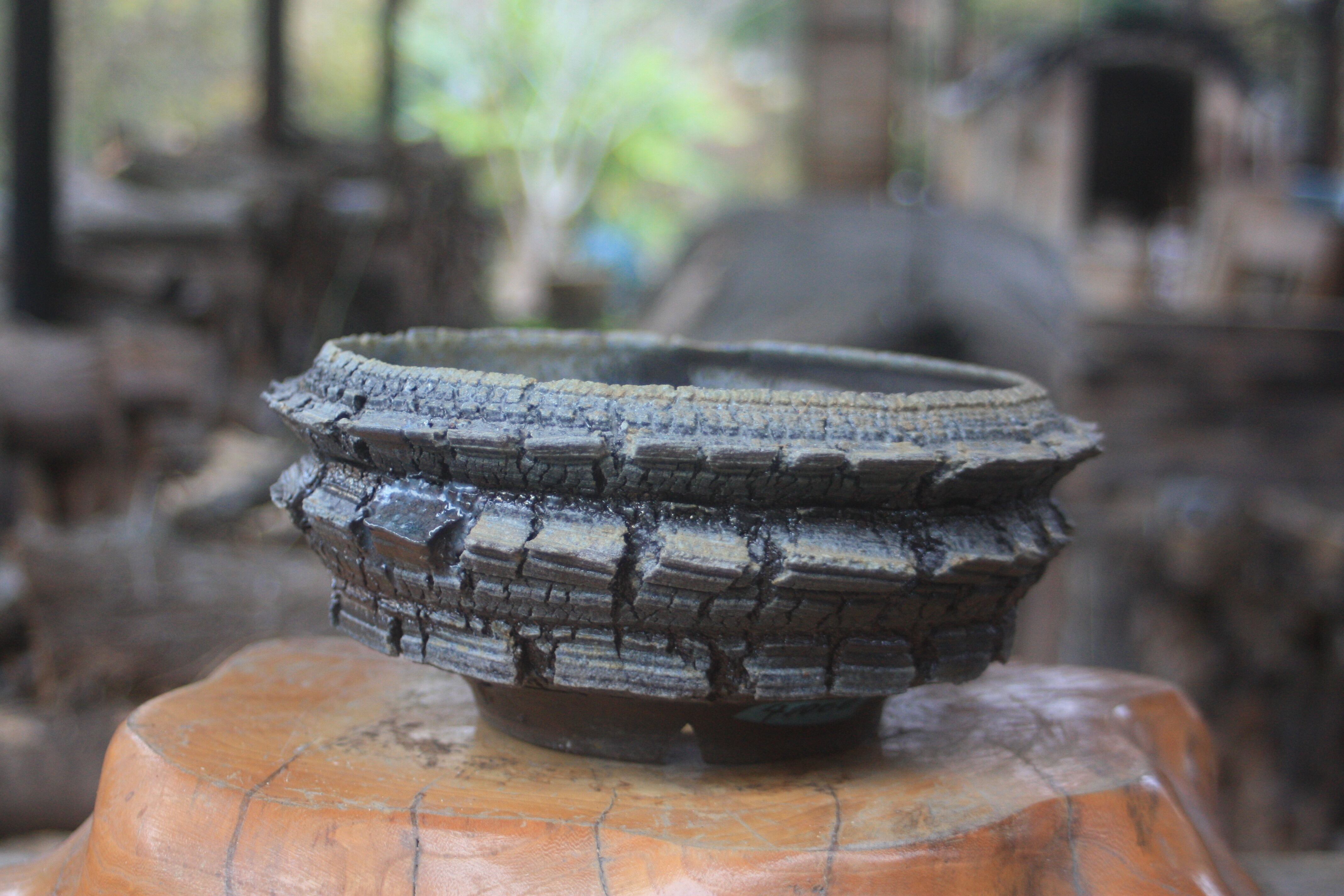這個盆器是在傳統的柴窯——也就是古老的「穴窯」中,經過三天三夜薪火淬煉而成。