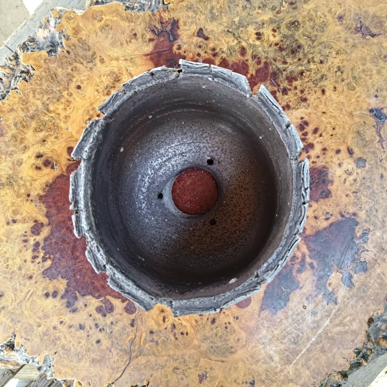 この植木鉢は穴窯という古いスタイルの薪窯で三日三晩薪をくべ続けて焼き込みました。