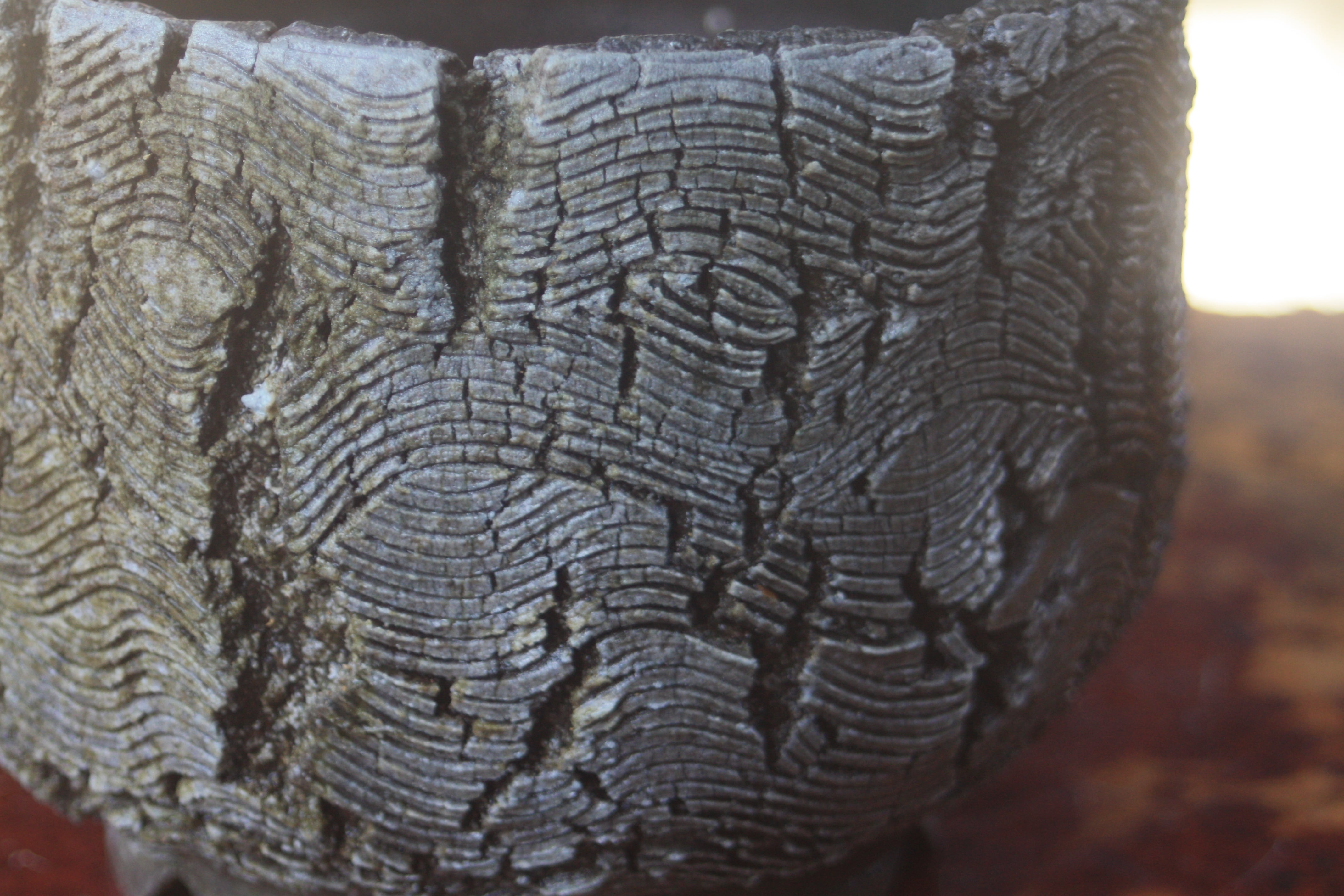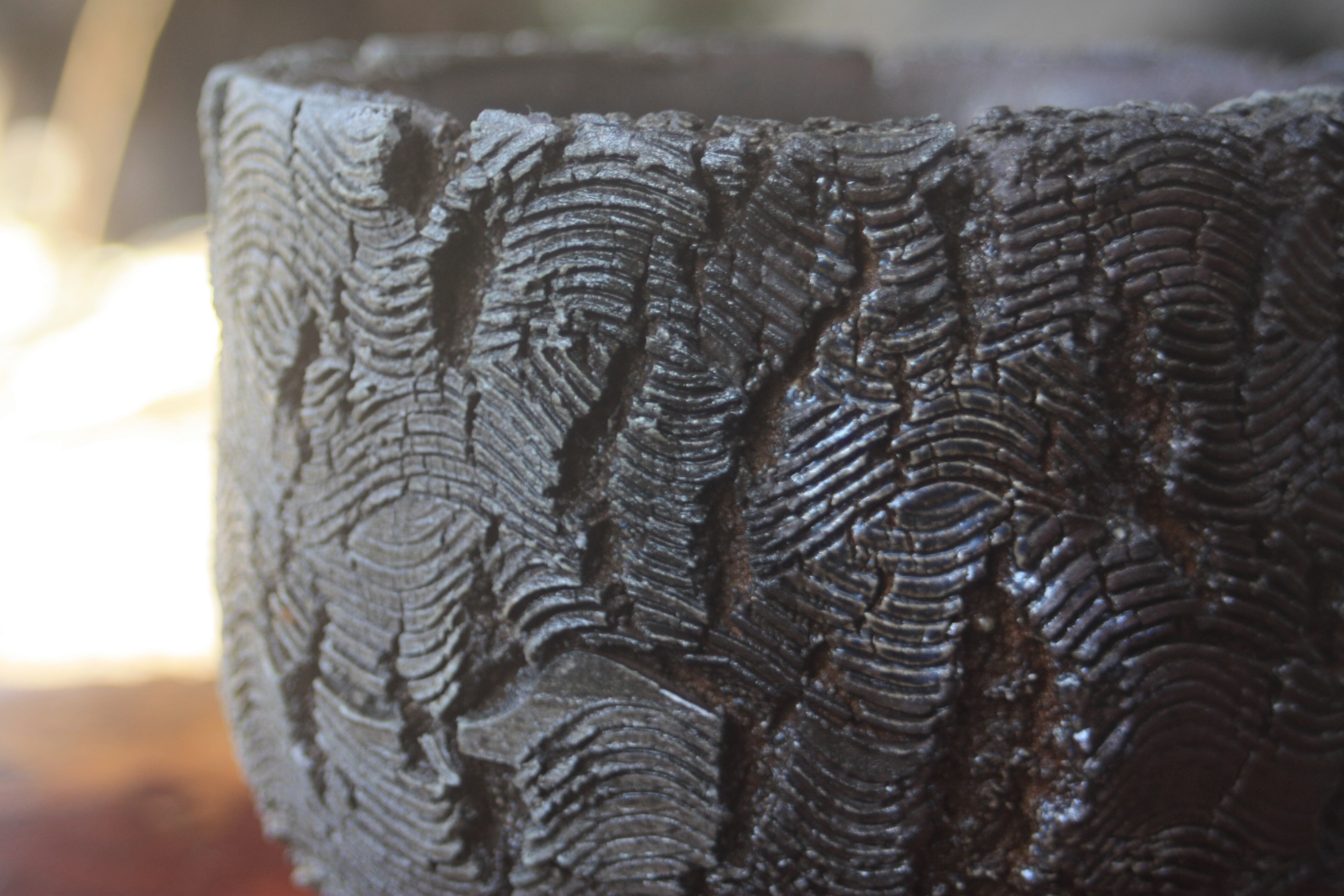 The ash from the bamboo, being resistant to melting, settled on the surface of the piece, creating a landscape reminiscent of frost.