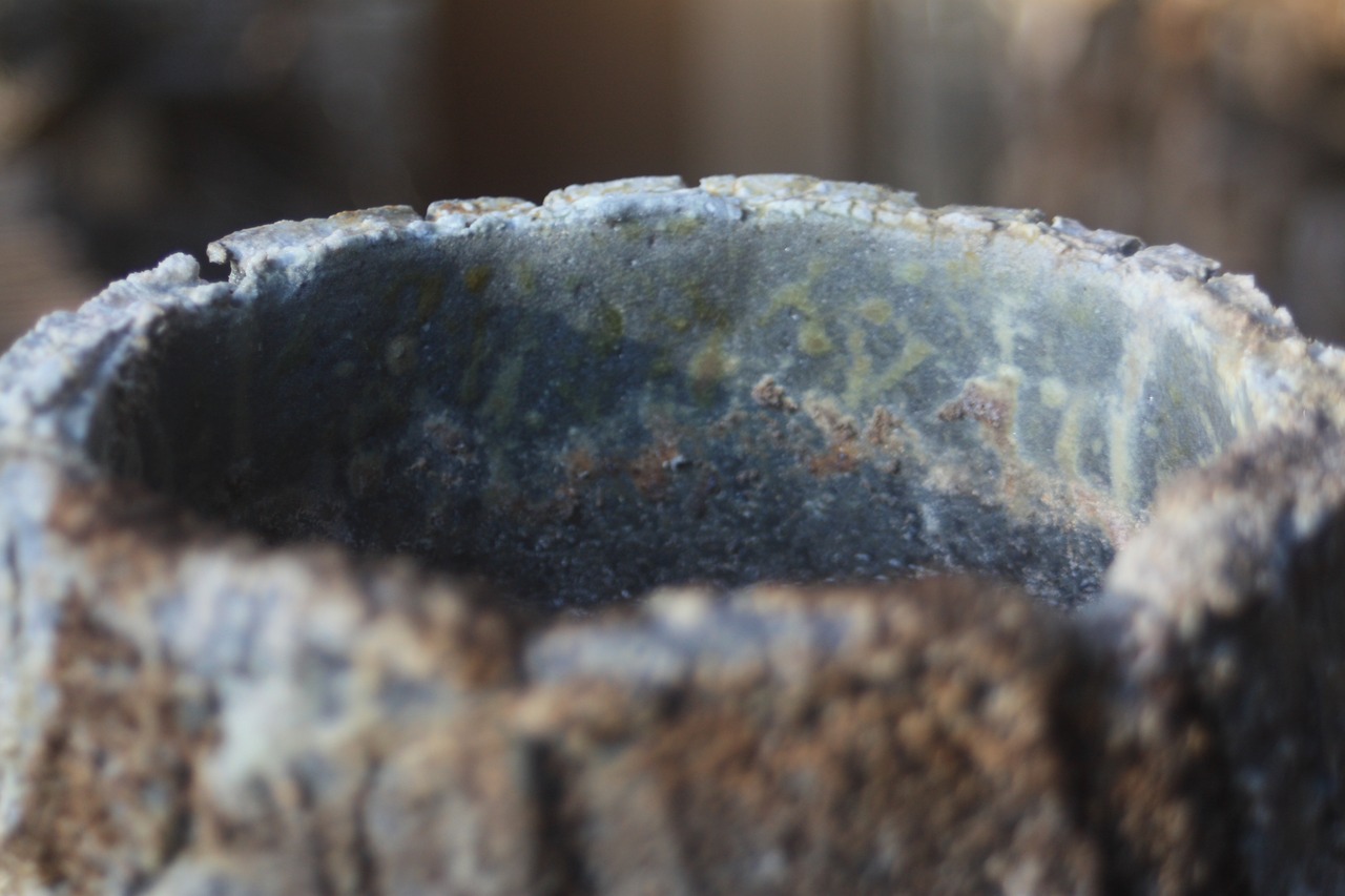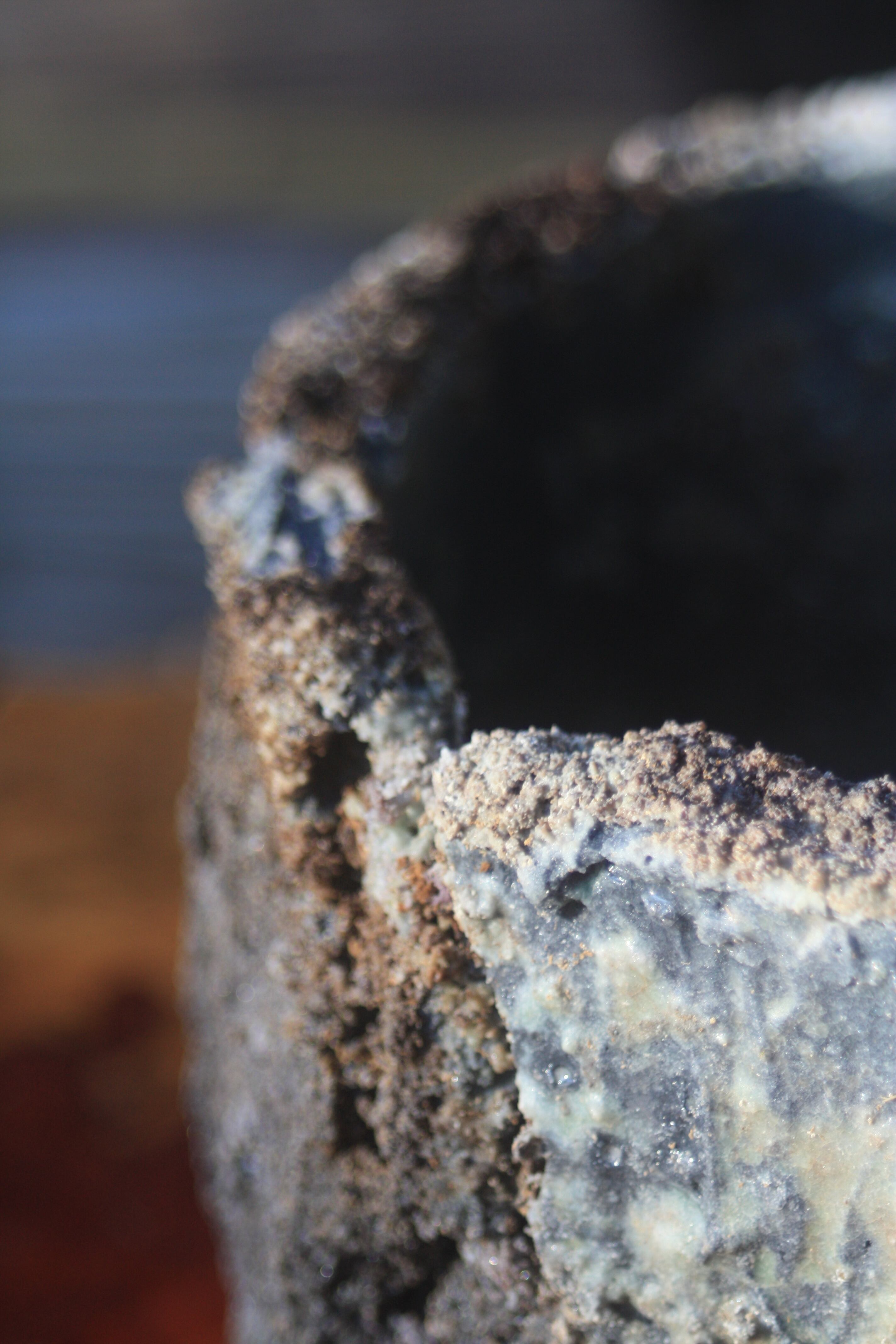 When placed in the anagama kiln, the piece was not only positioned near the firebox, where kiln transformations occur, but was also buried in ash during firing.