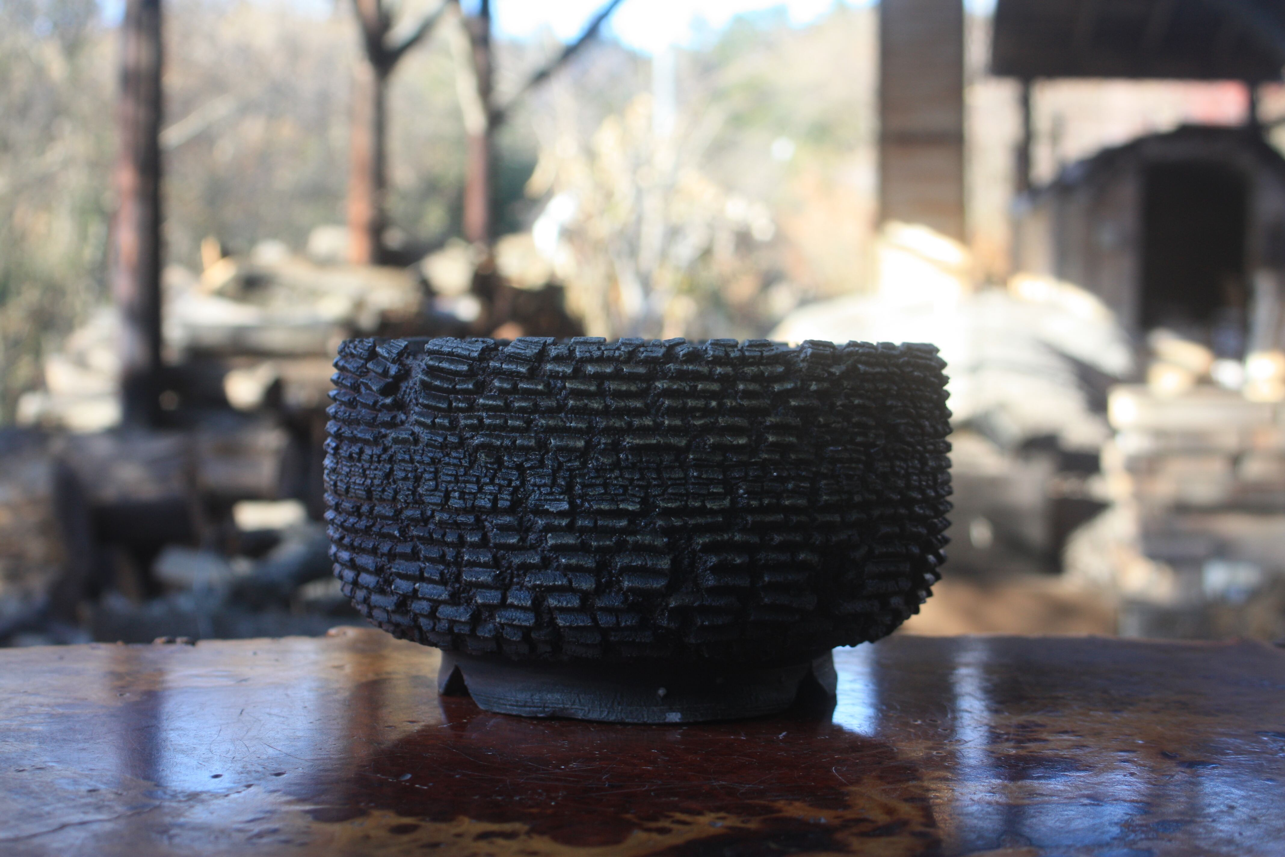 The ash from the bamboo, being resistant to melting, settled on the surface of the piece, creating a landscape reminiscent of frost.