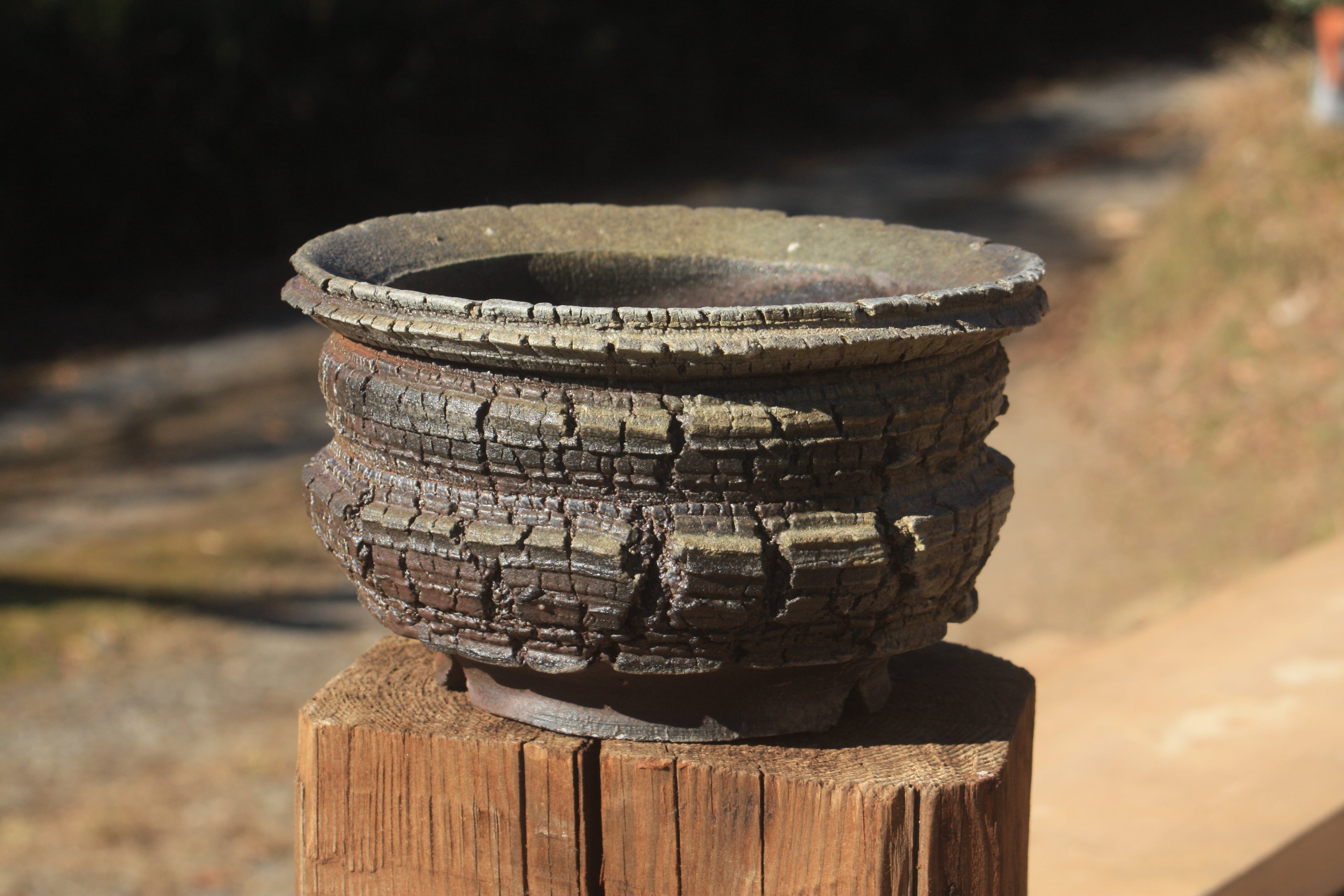 這個盆器是在傳統的柴窯——也就是古老的「穴窯」中,經過三天三夜薪火淬煉而成。