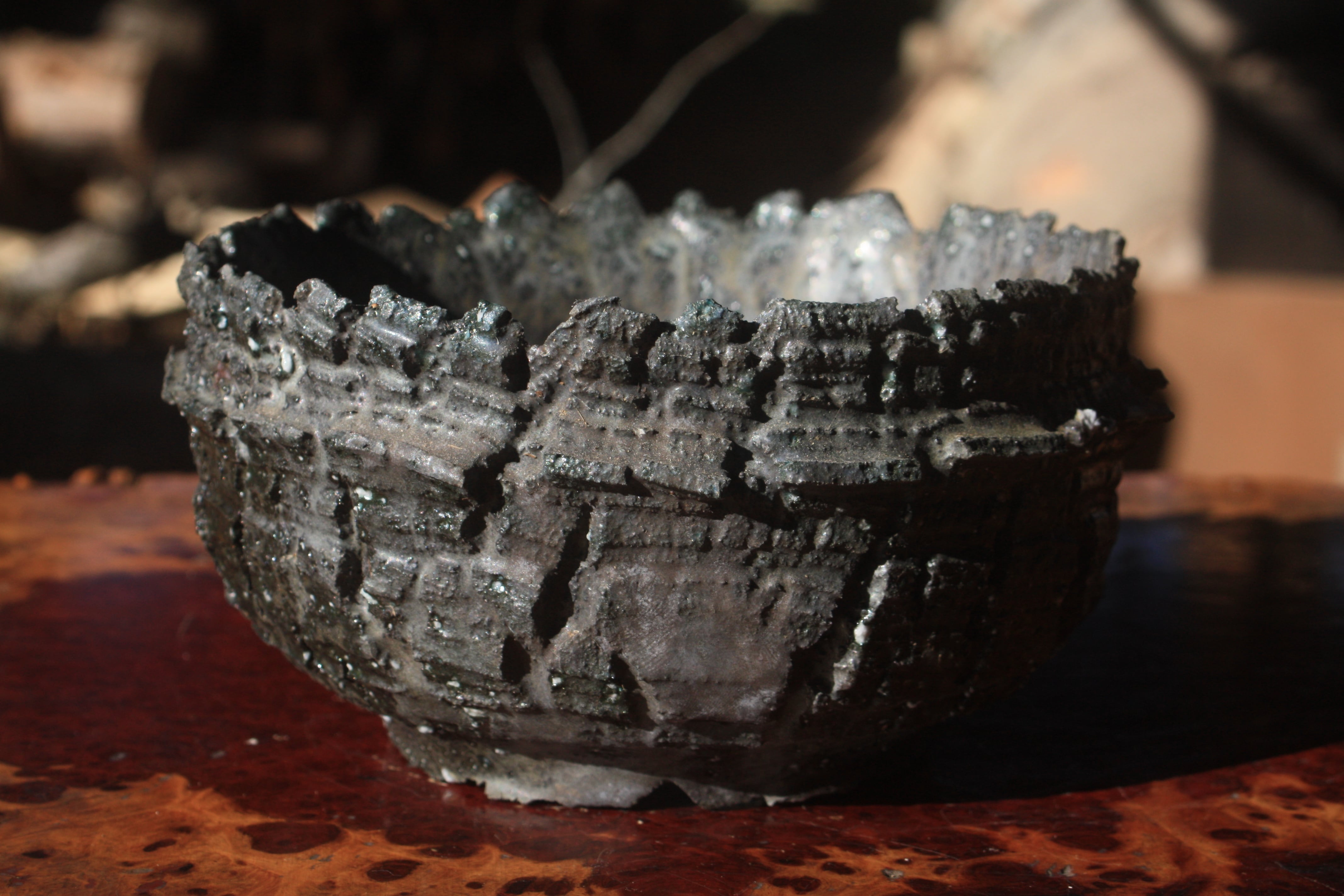 黒御影土の器表面に亀裂を入れ穴窯焼成しました。