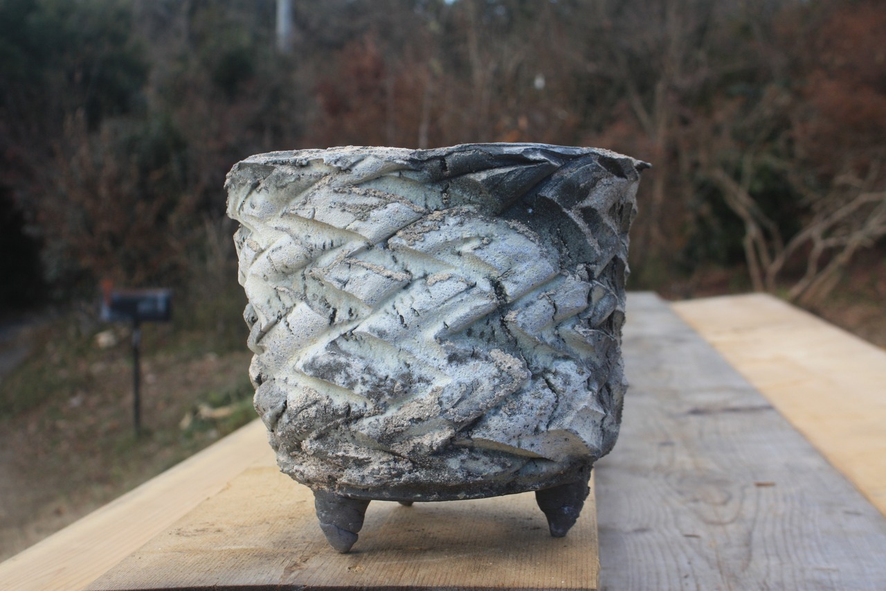 こちらの植木鉢は成形後に匣鉢に入れ、薪ストーブや穴窯焼成で出た灰に埋めて焼成しました。