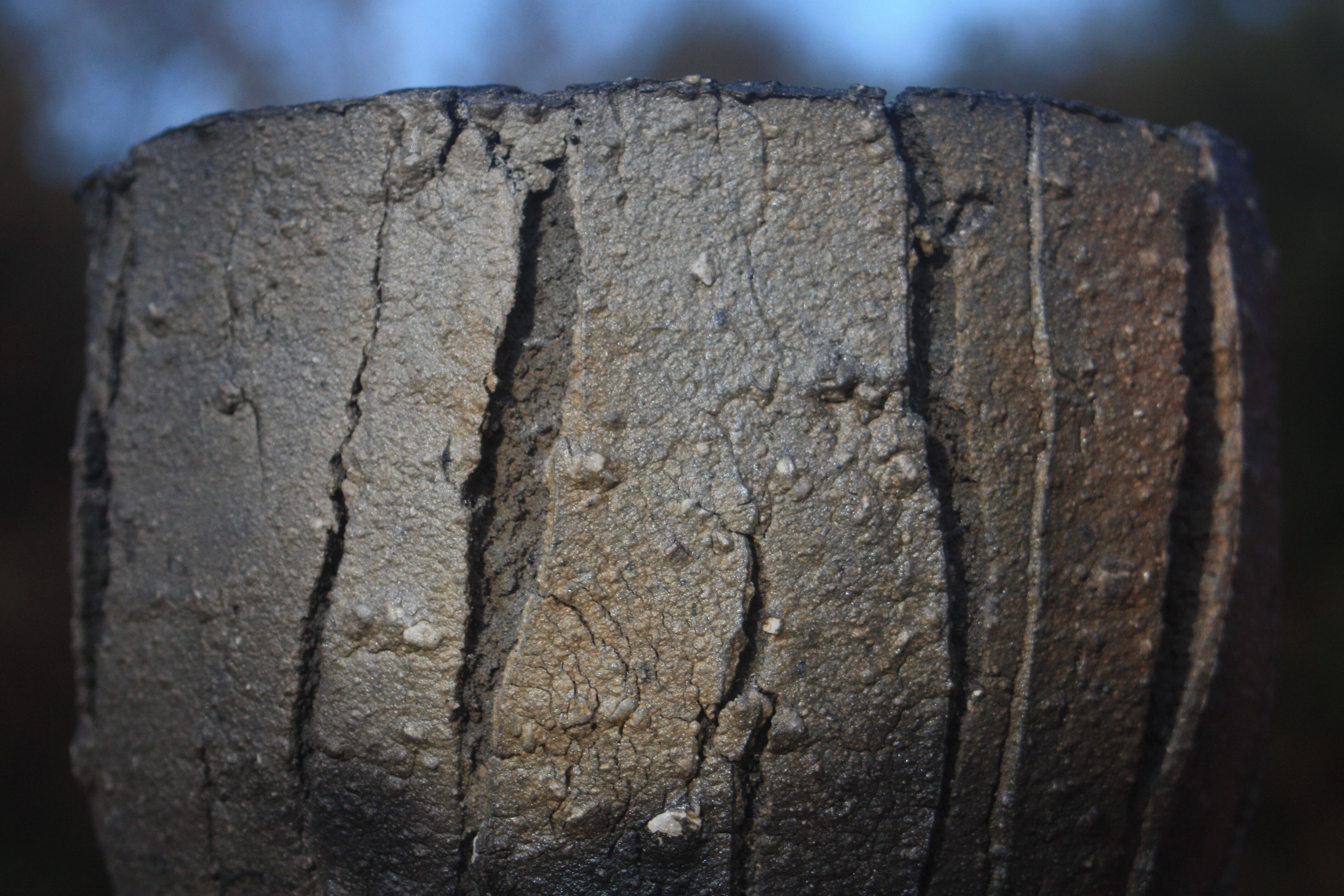 器表面に泥漿した信楽原土を塗った後に裂け目を作り炭埋め焼成した鉢です。