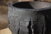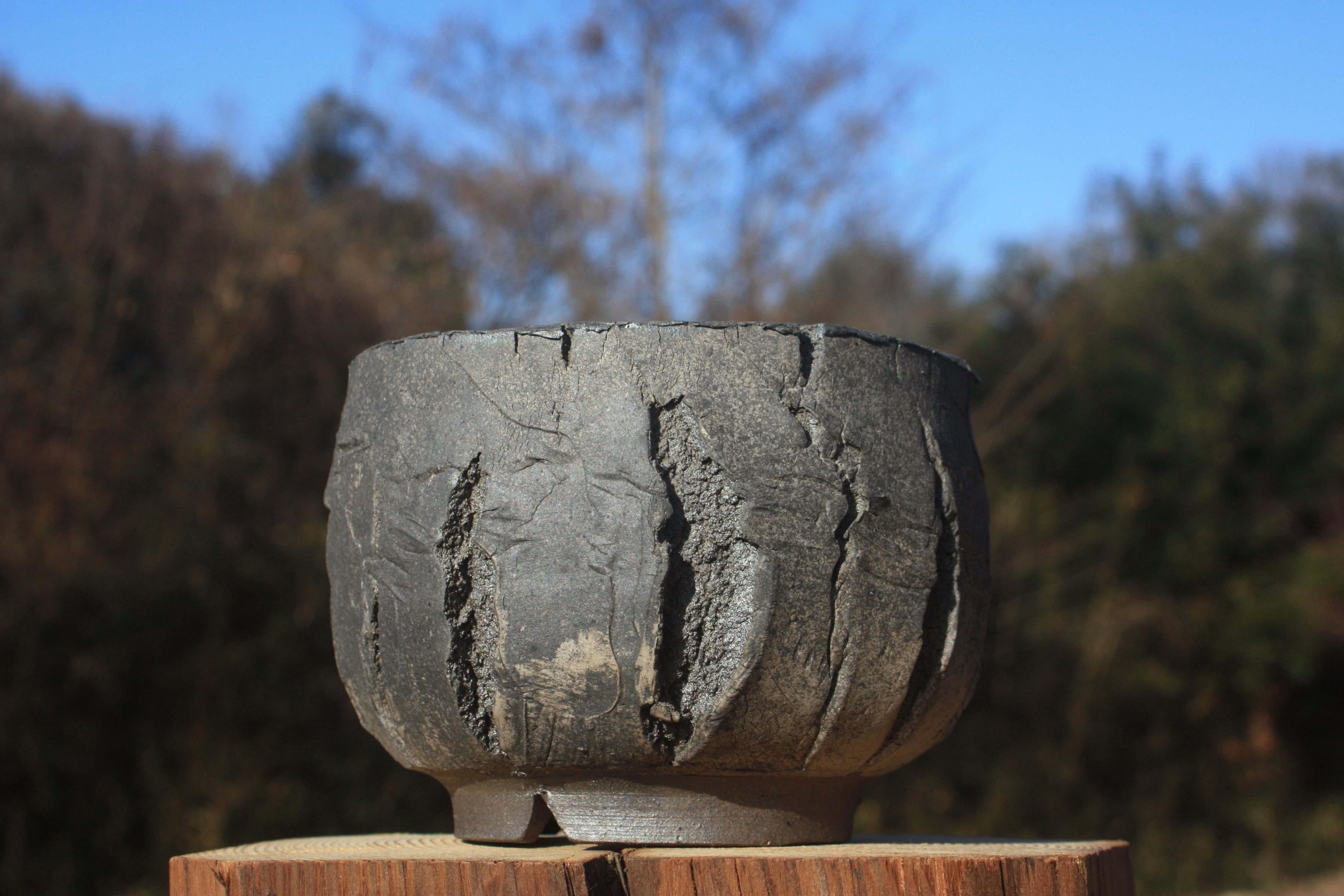白泥を器表面に塗った後裂け目を作り炭埋め焼成した鉢です。