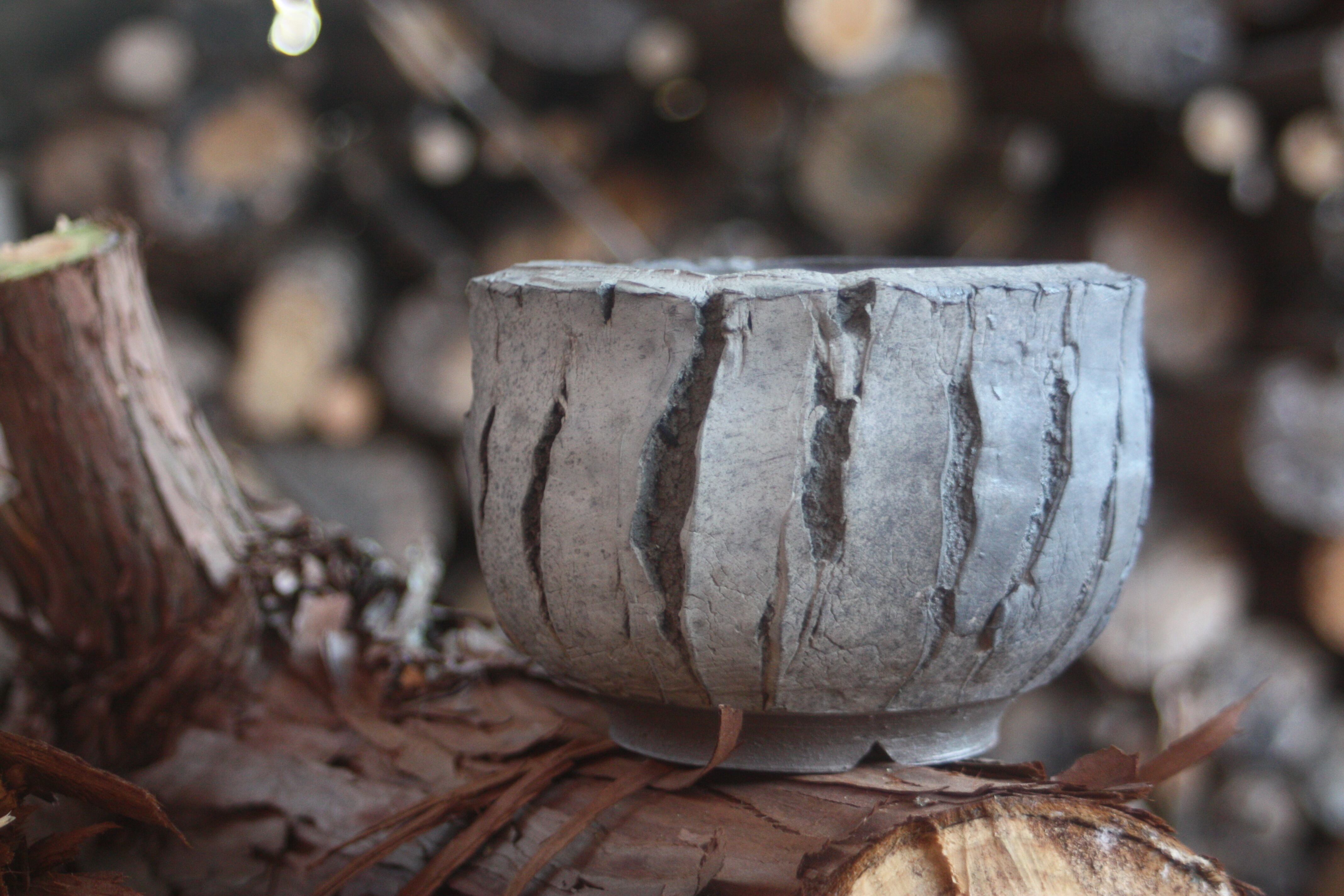 白泥を器表面に塗った後裂け目を作り炭埋め焼成した鉢です。