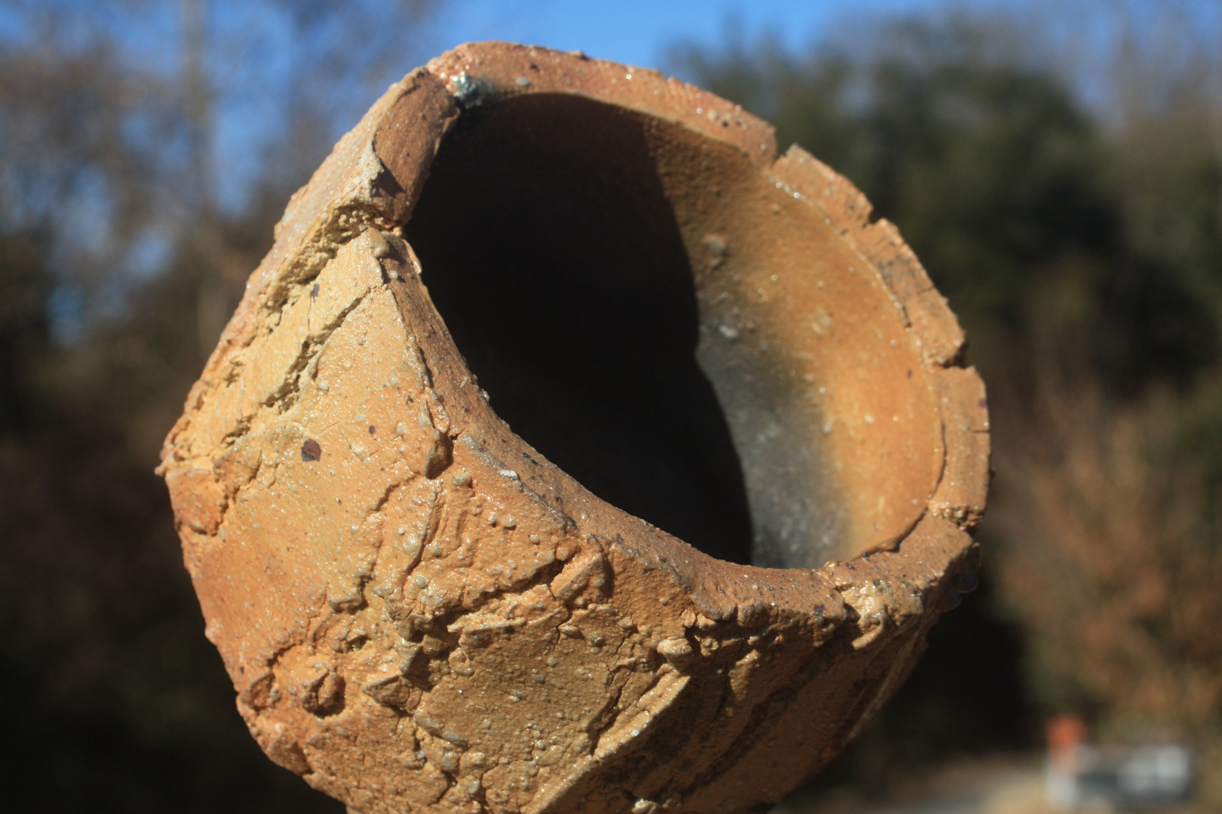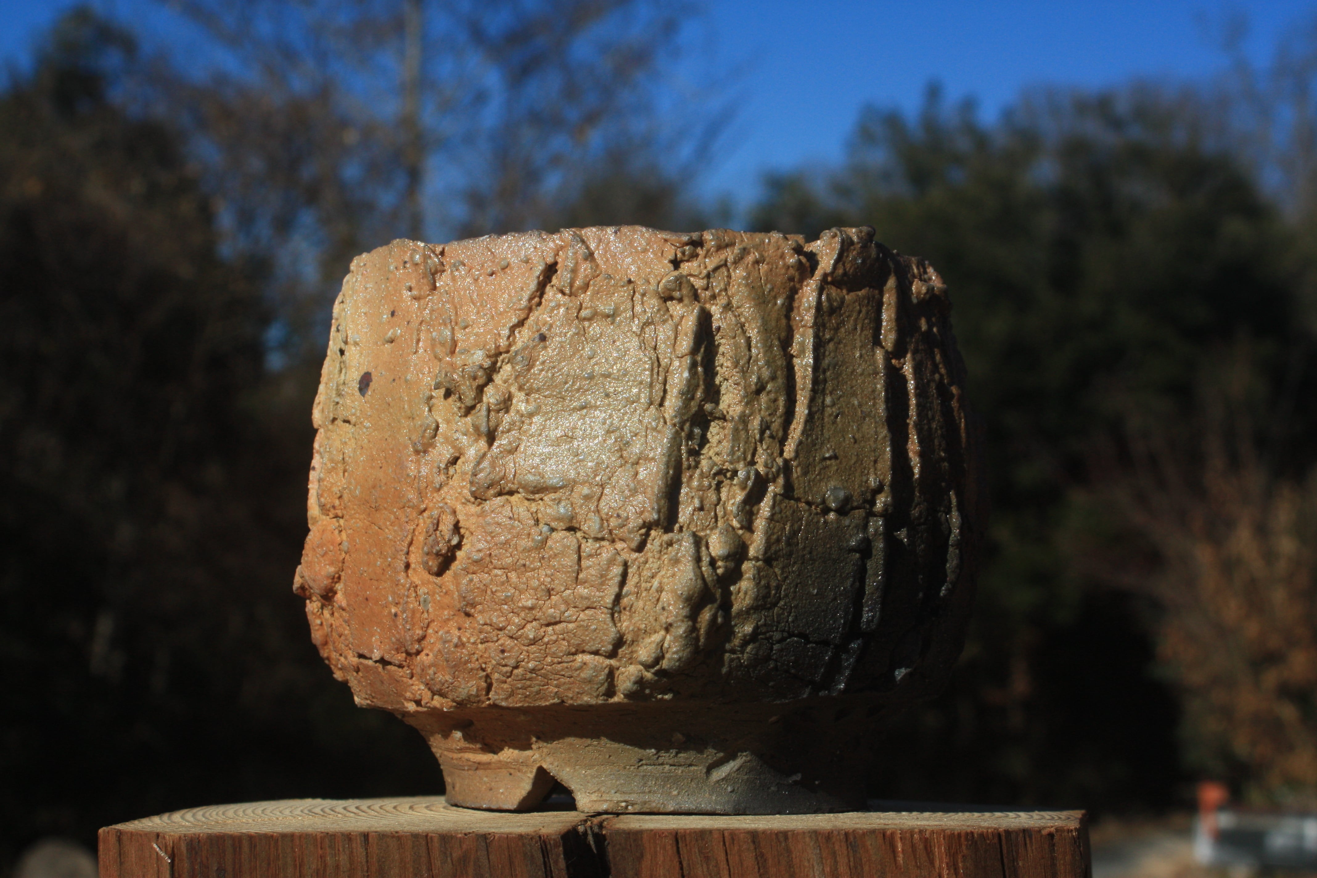器表面に泥漿した信楽原土を塗った後に裂け目を作り炭埋め焼成した鉢です。