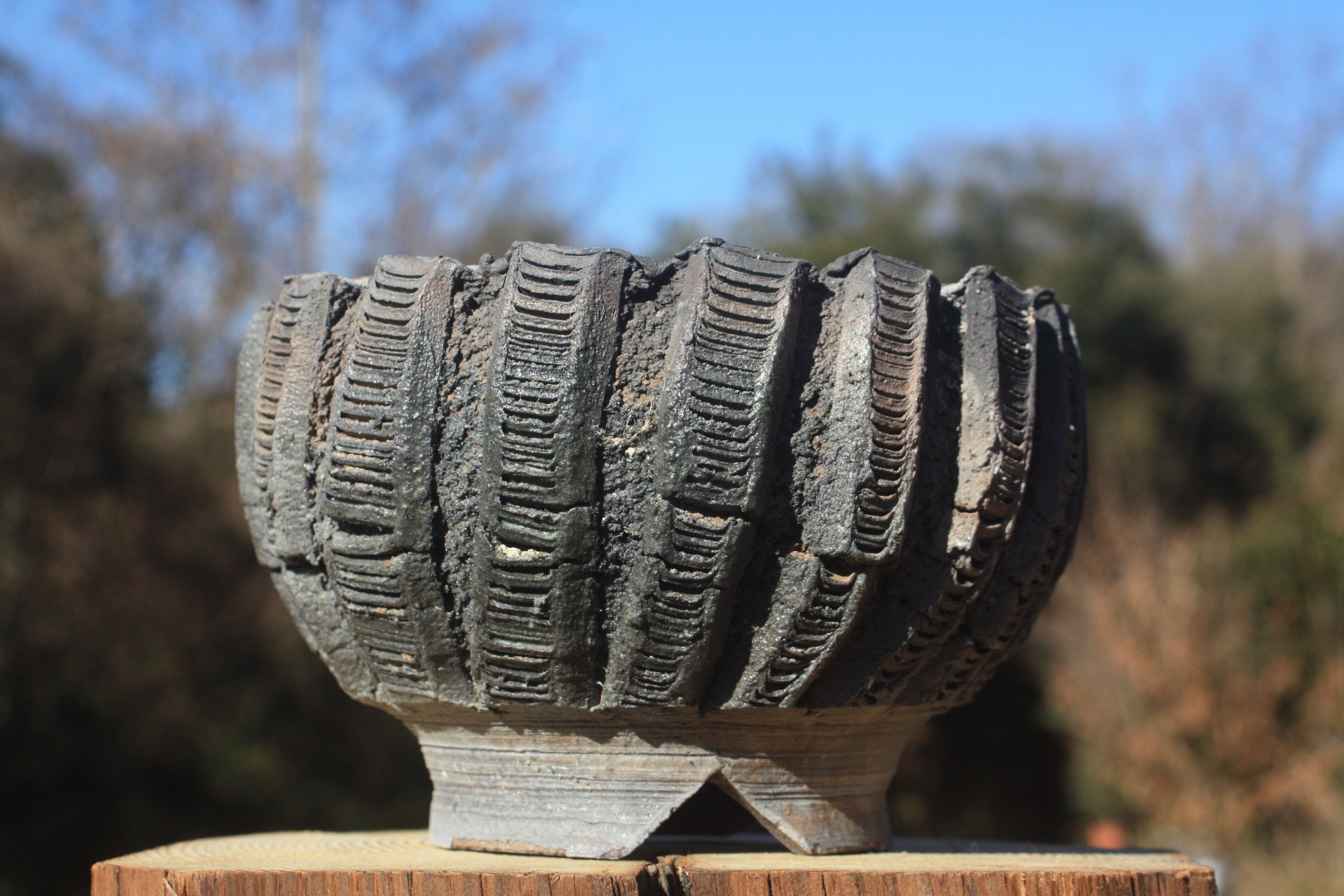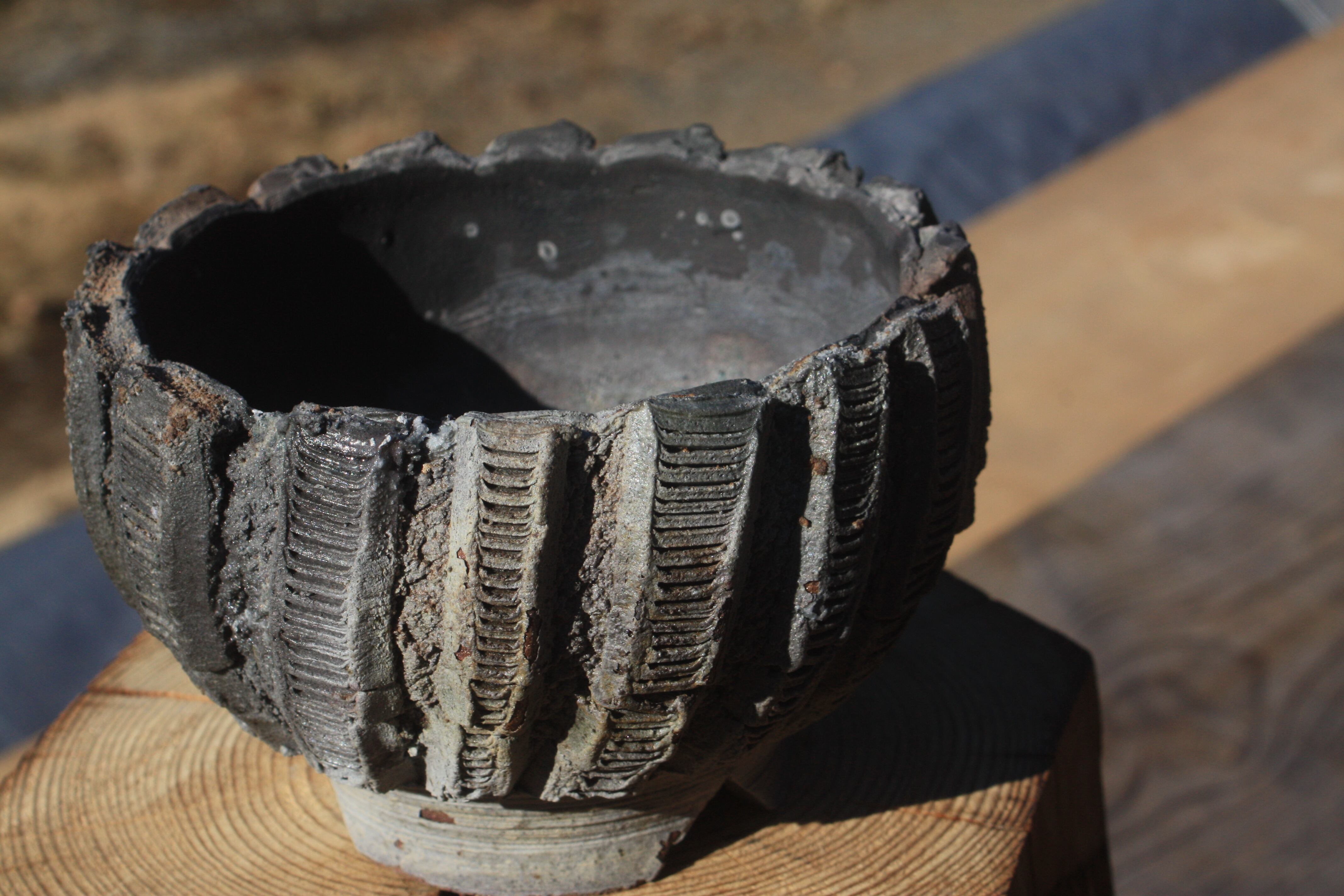 こちらの植木鉢は匣鉢に入れて益子産の竹炭と籾殻に埋めて焼成しています。