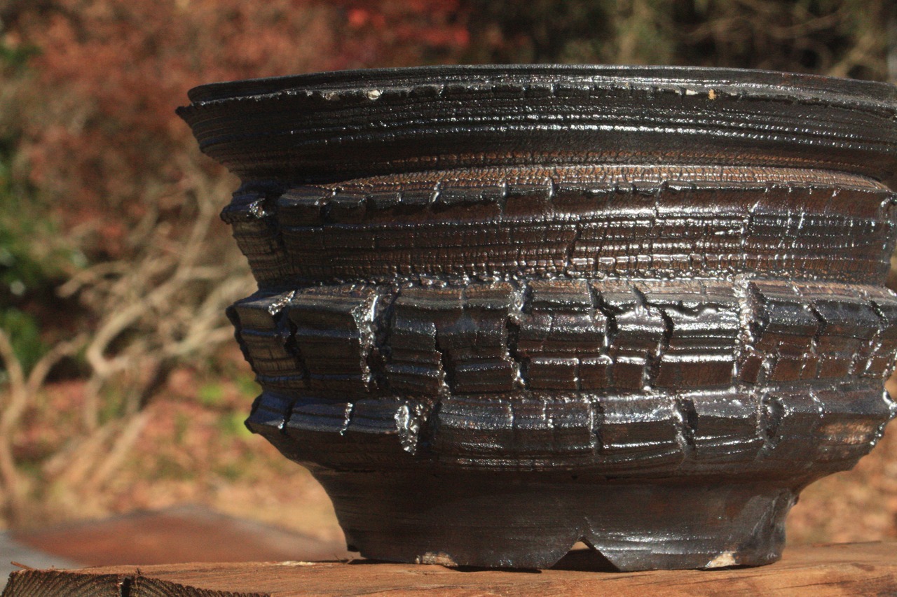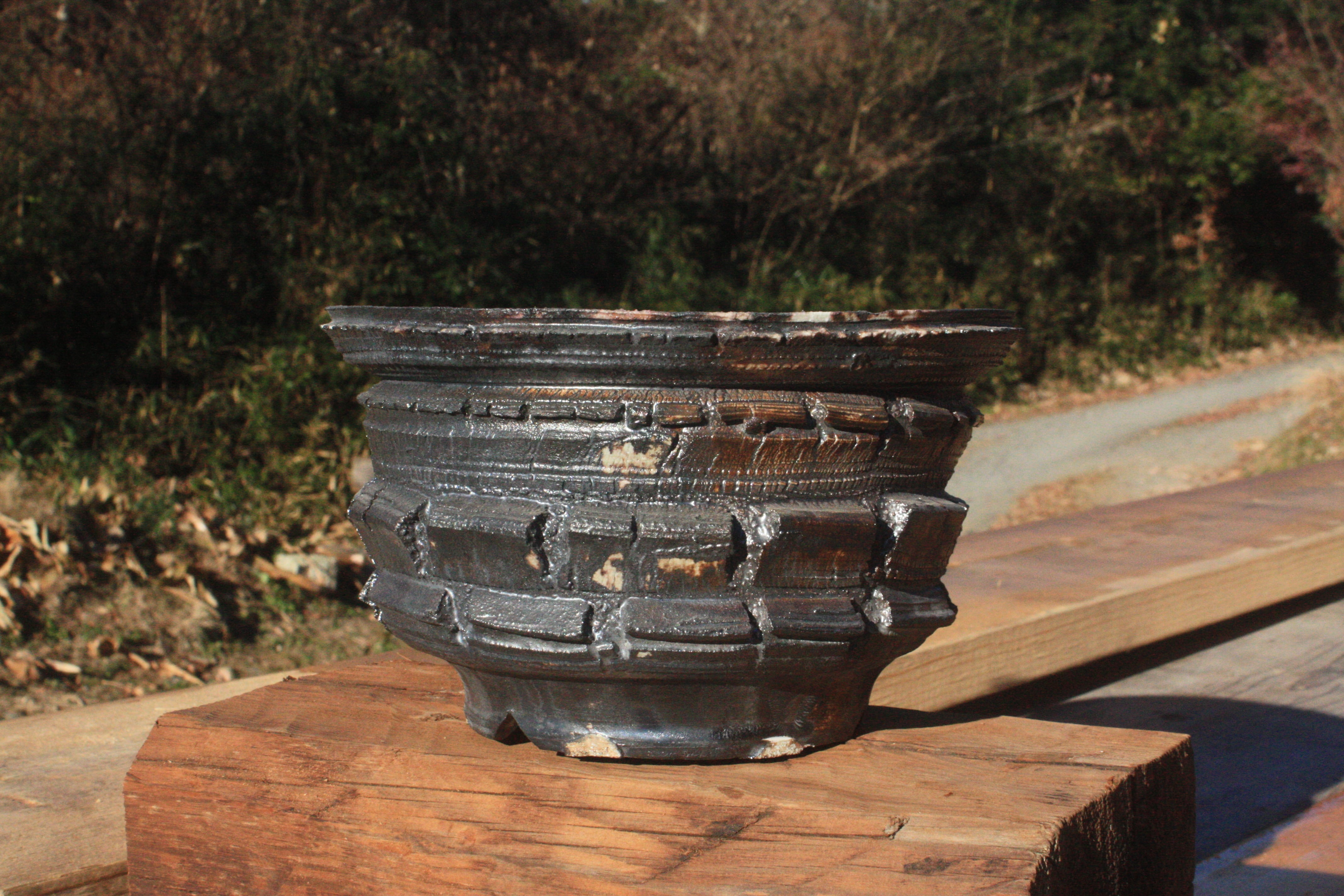 這個盆器是以信樂水簸土為原料,淋上錳釉後,在穴窯中進行燒製。